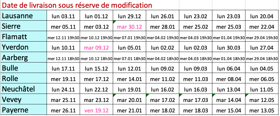 Les livraisons sont régulières et effectuées à des heures fixes toutes les 4 semaines aux mêmes points de retrait pour garantir une disponibilité constante.